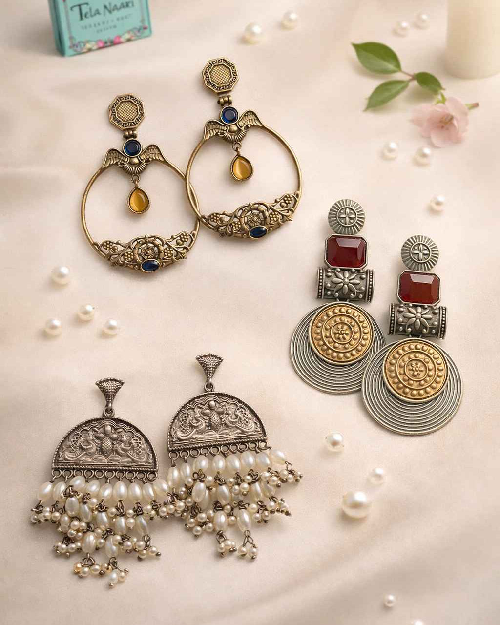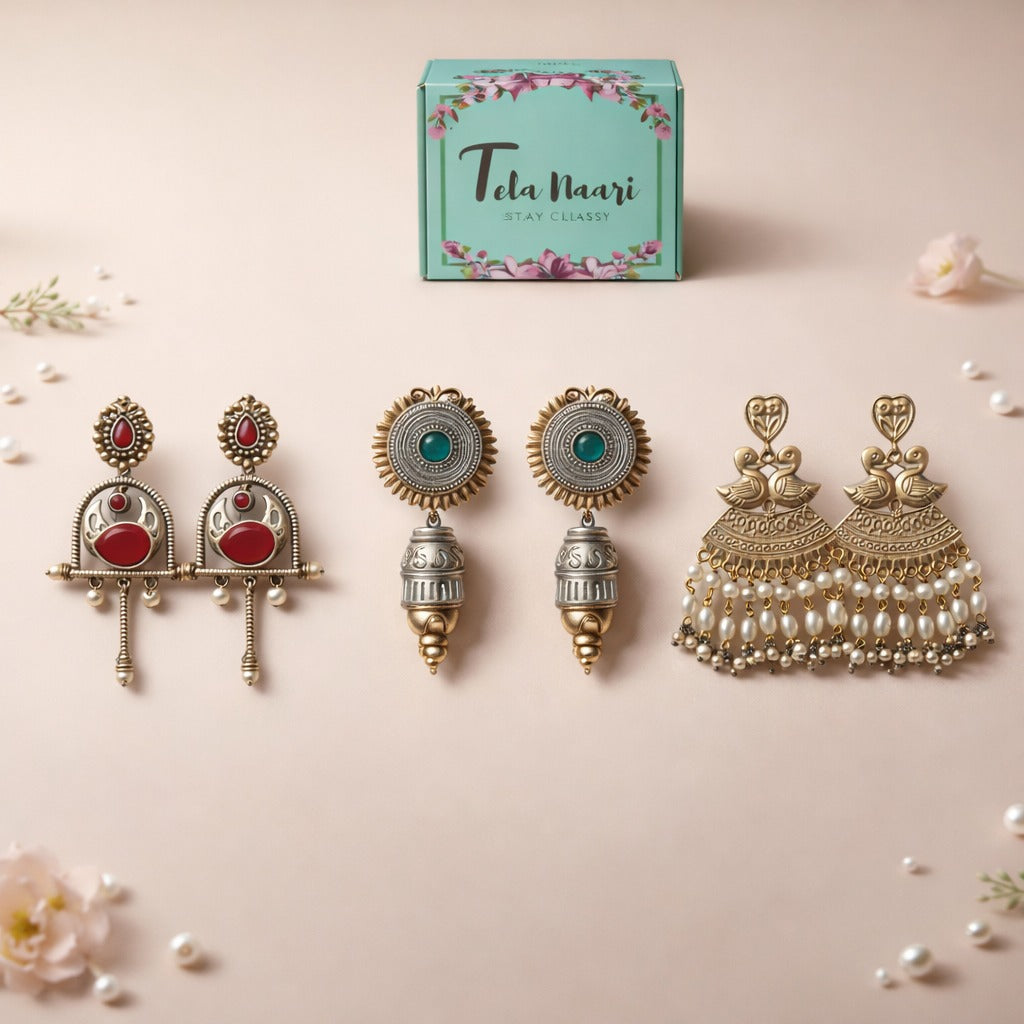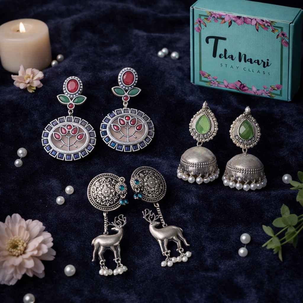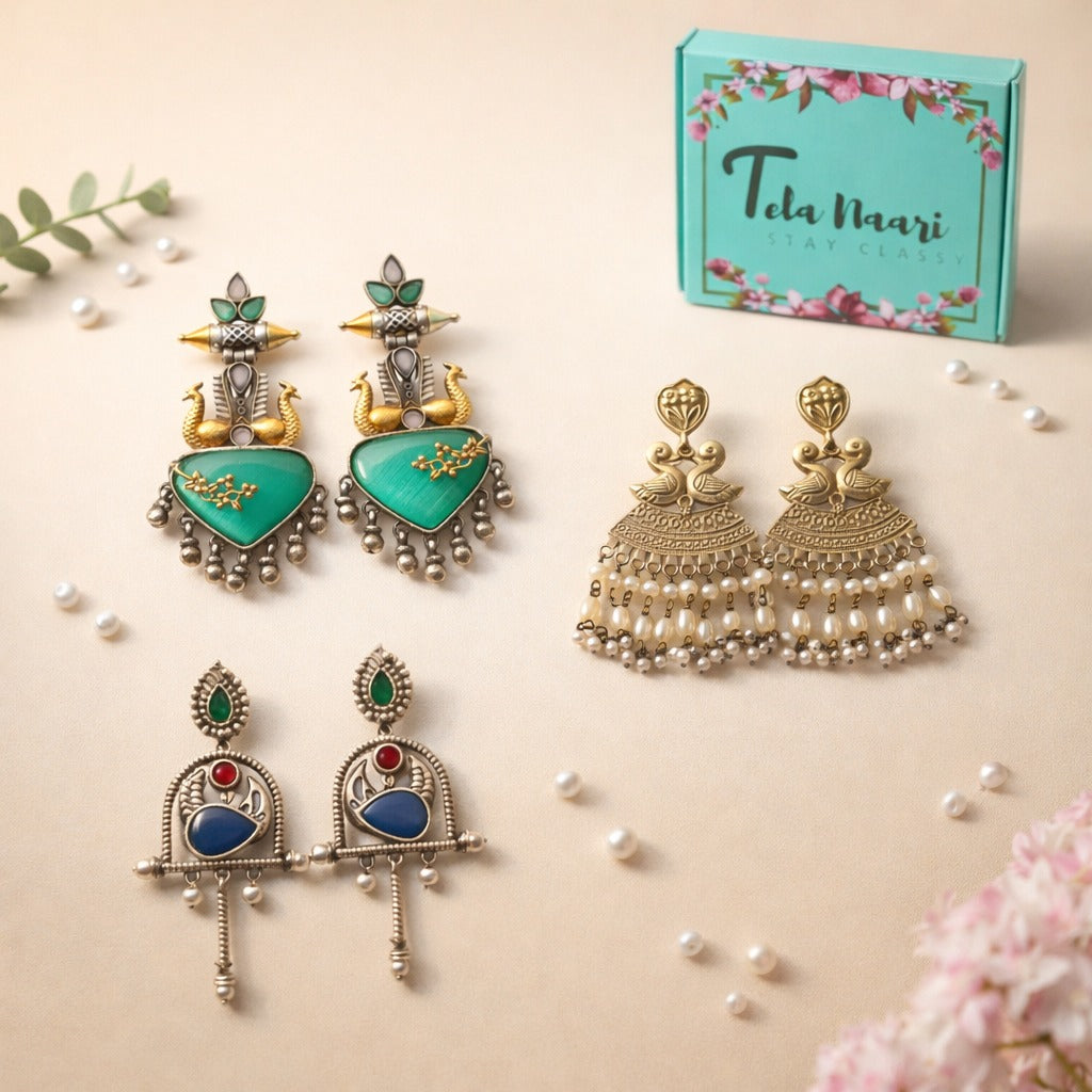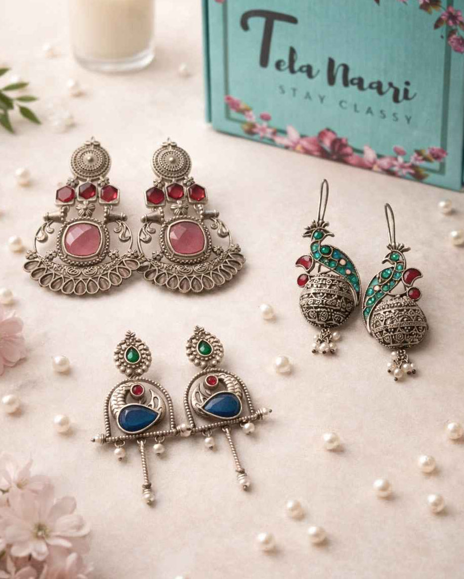 From antique jhumkis and oxidised chandbalis to statement necklaces and pearl danglers, every piece tells a story of grace and individuality. Whether you're dressing up for a wedding, a festive occasion, or an everyday look, Tela Naari ensures you shine effortlessly.