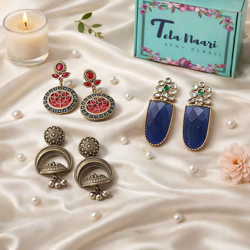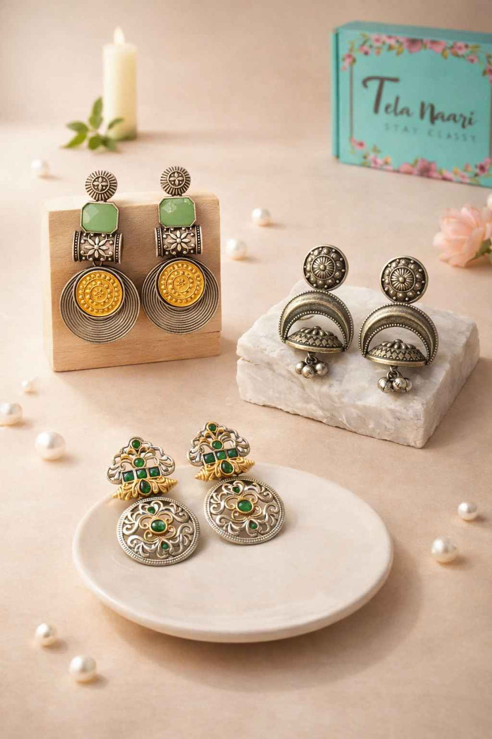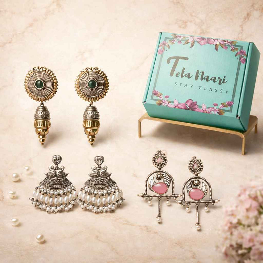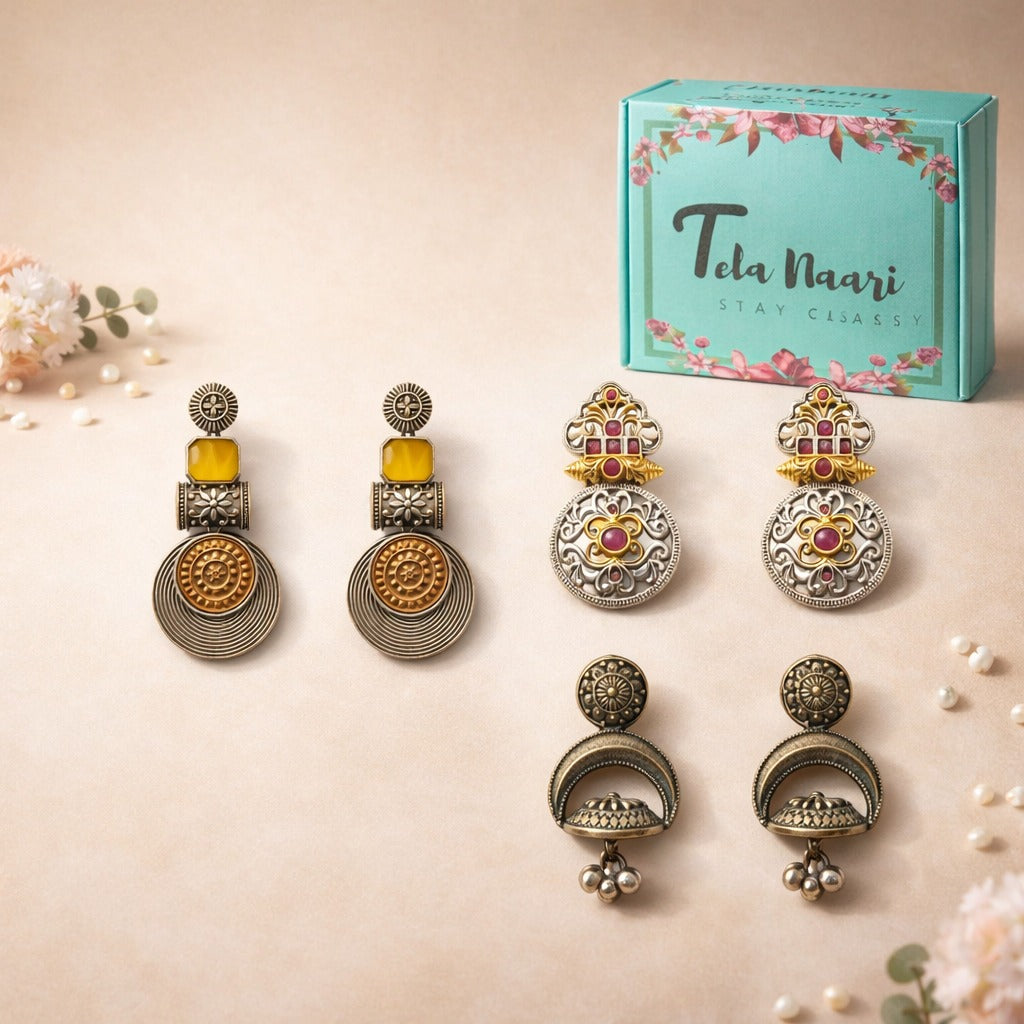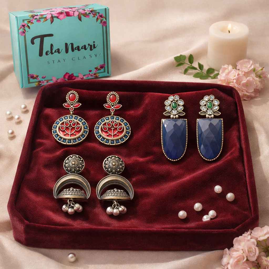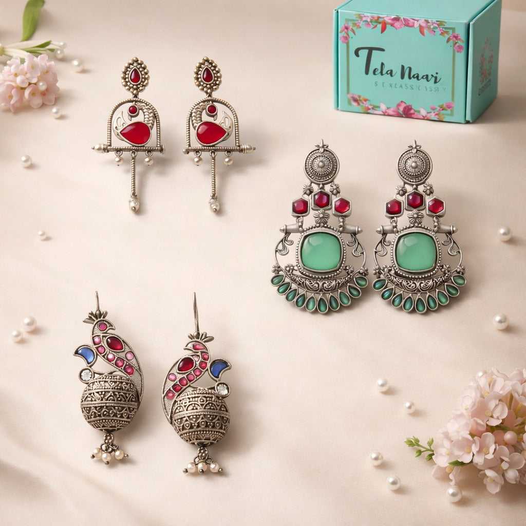 From antique jhumkis and oxidised chandbalis to statement necklaces and pearl danglers, every piece tells a story of grace and individuality. Whether you're dressing up for a wedding, a festive occasion, or an everyday look, Tela Naari ensures you shine effortlessly.