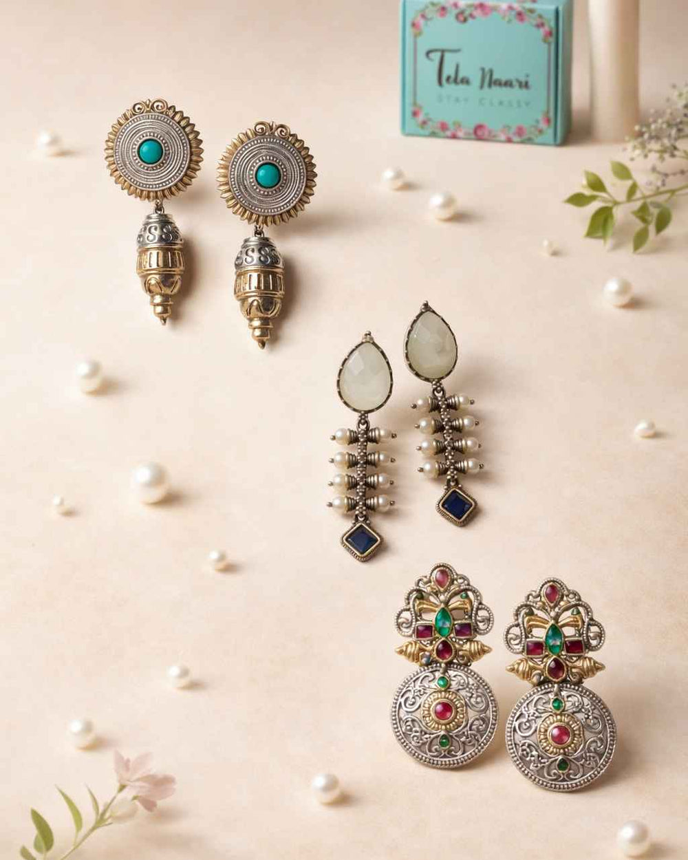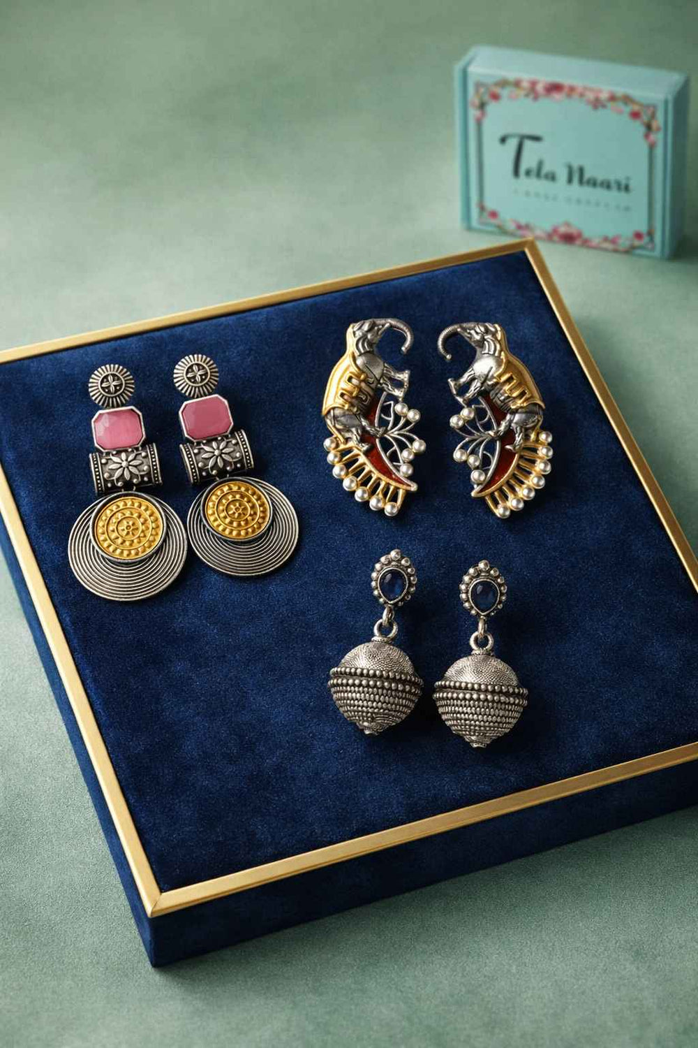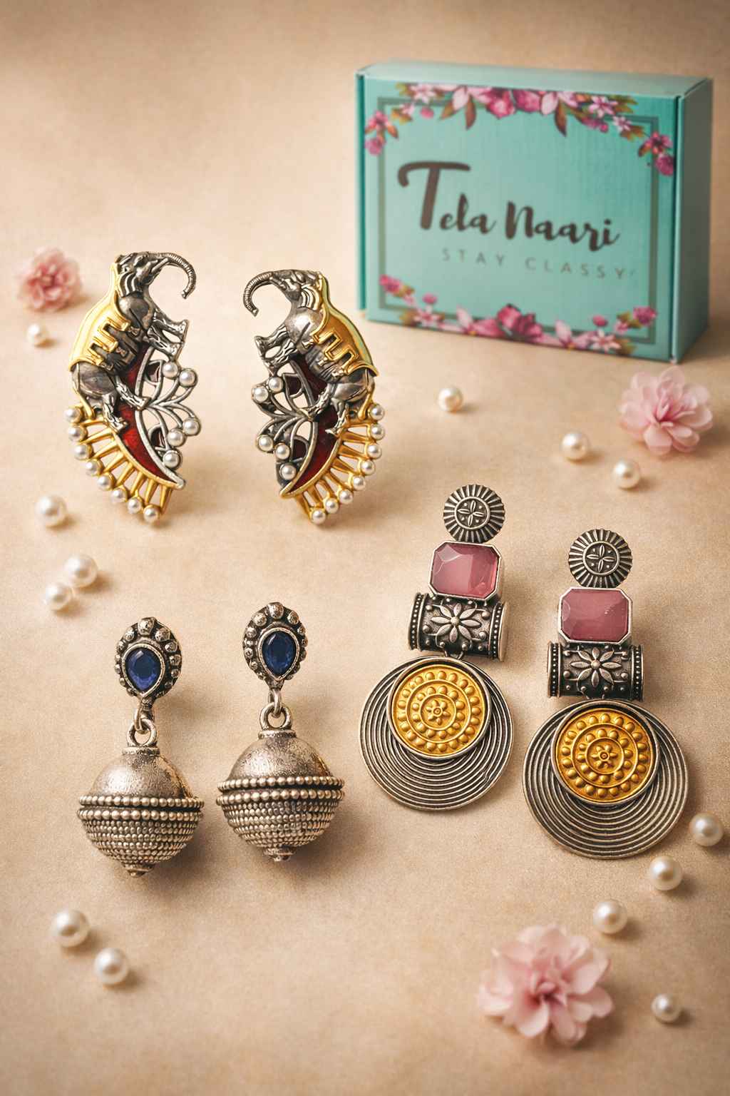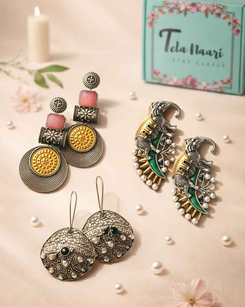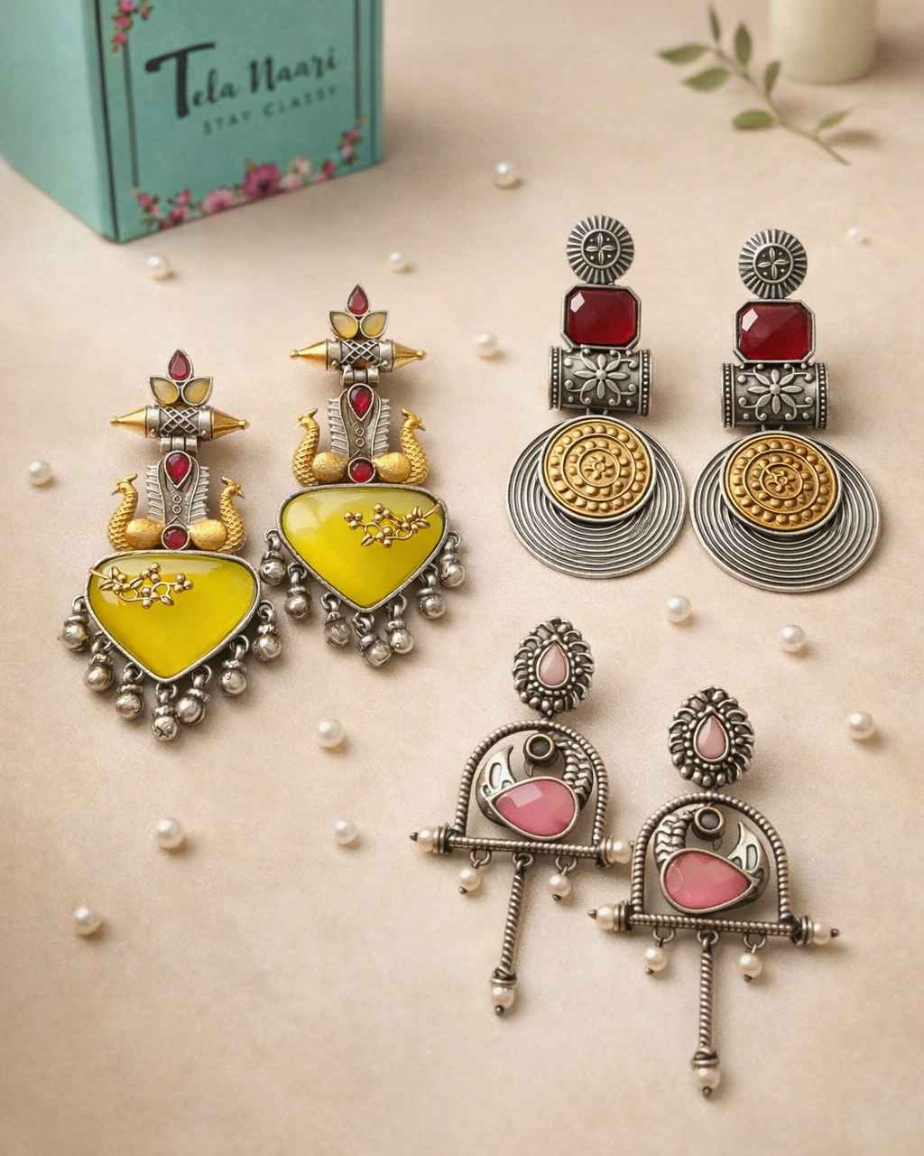 From antique jhumkis and oxidised chandbalis to statement necklaces and pearl danglers, every piece tells a story of grace and individuality. Whether you're dressing up for a wedding, a festive occasion, or an everyday look, Tela Naari ensures you shine effortlessly.