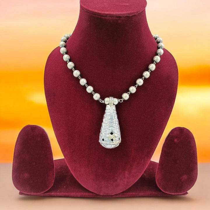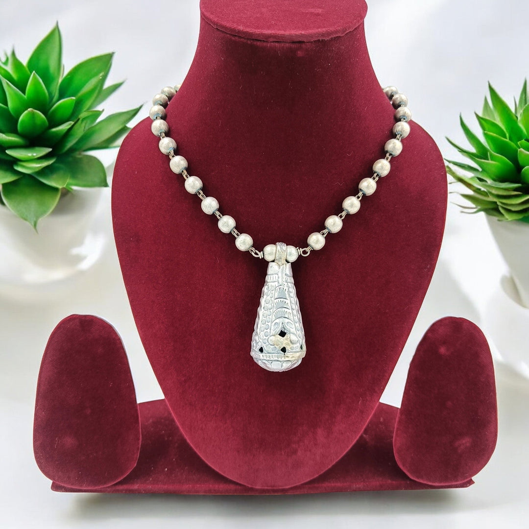 Embrace timeless elegance with this silver oxidised necklace set. Crafted as an antique necklace, it stands out as a statement necklace with intricate detailing. Perfect for adding a touch of sophistication to your look at formal events, festive celebrations, or casual outings.