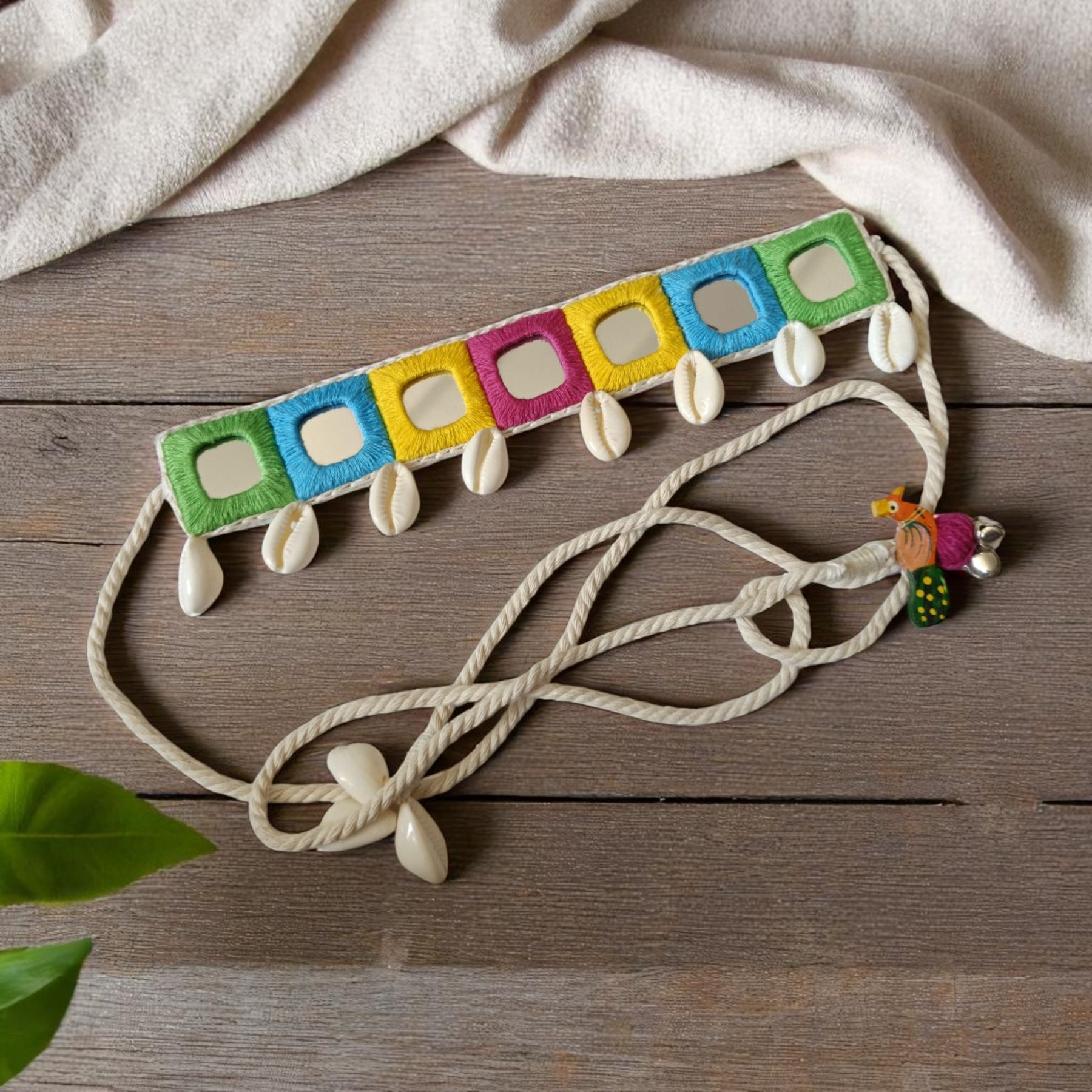 Elevate your accessory collection with the Tela Naari Pastel Multicolor Cowrie Shell Fabric Choker, a graceful fusion of traditional craftsmanship and modern aesthetics. Designed with delicate pastel threadwork, radiant mirror embellishments, and natural cowrie shells, this lightweight choker perfectly captures the spirit of timeless ethnic elegance. A versatile piece ideal for festive occasions and casual ethnic styling, it pays homage to heritage while celebrating contemporary charm.