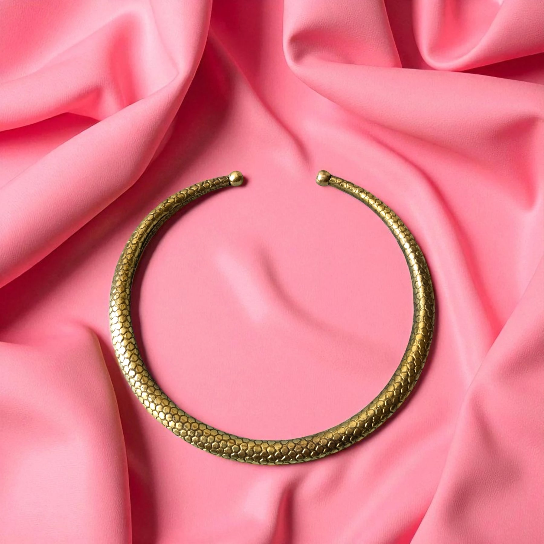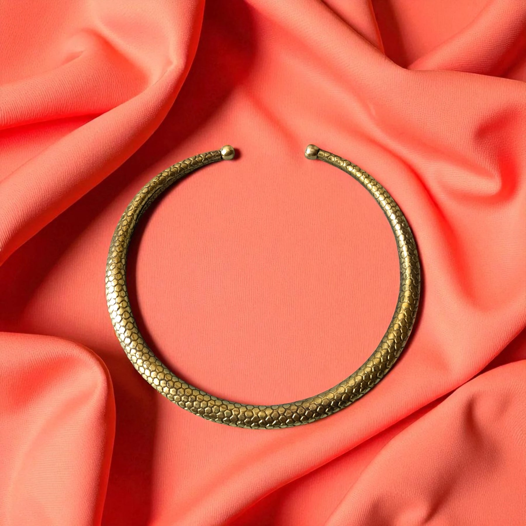 This handcrafted golden brass Hasli features a unique scale-textured finish, giving it a bold and regal presence. Perfect as a festive or bridal choker, it can be styled solo for statement elegance or layered with ethnic jewelry for a grand, luxurious look.