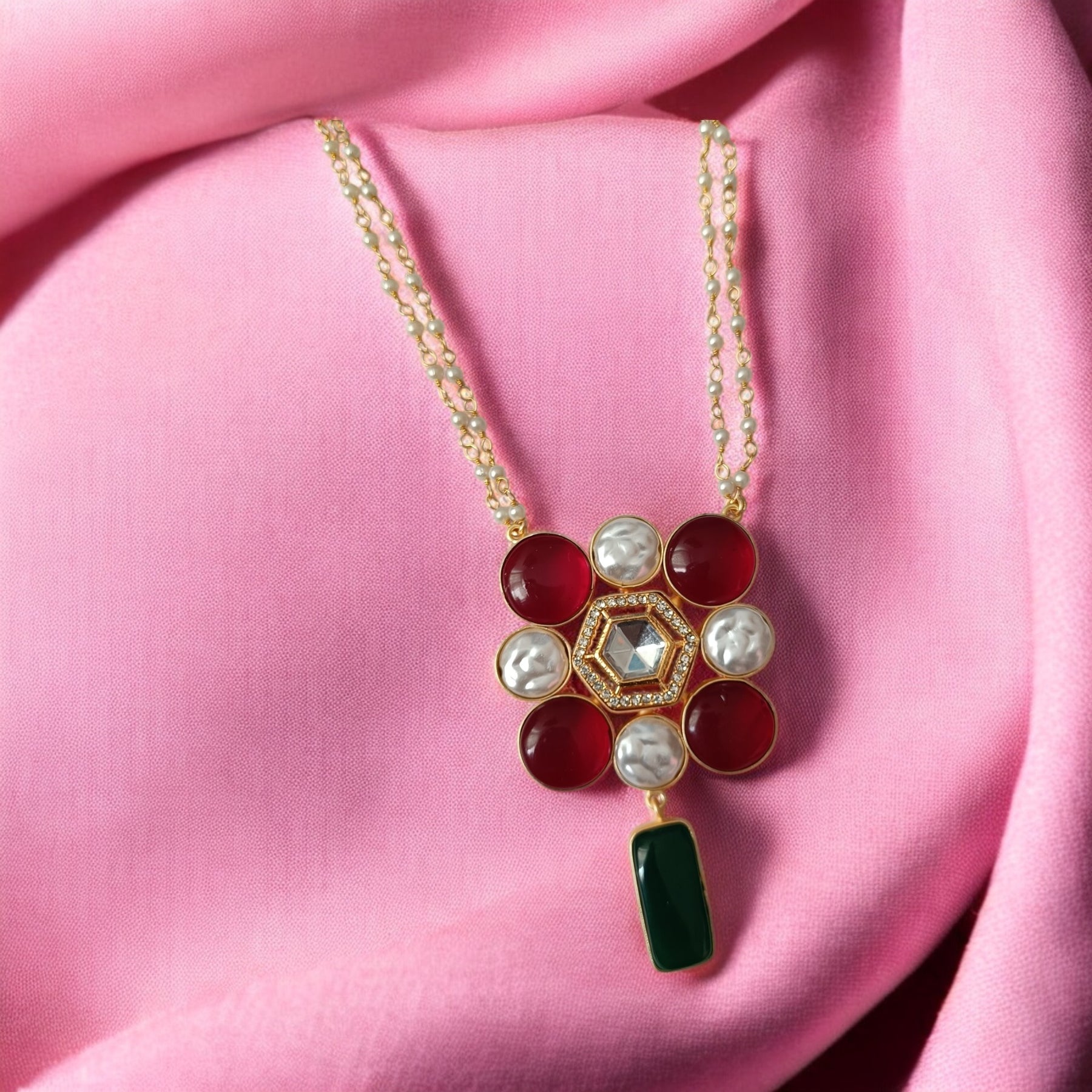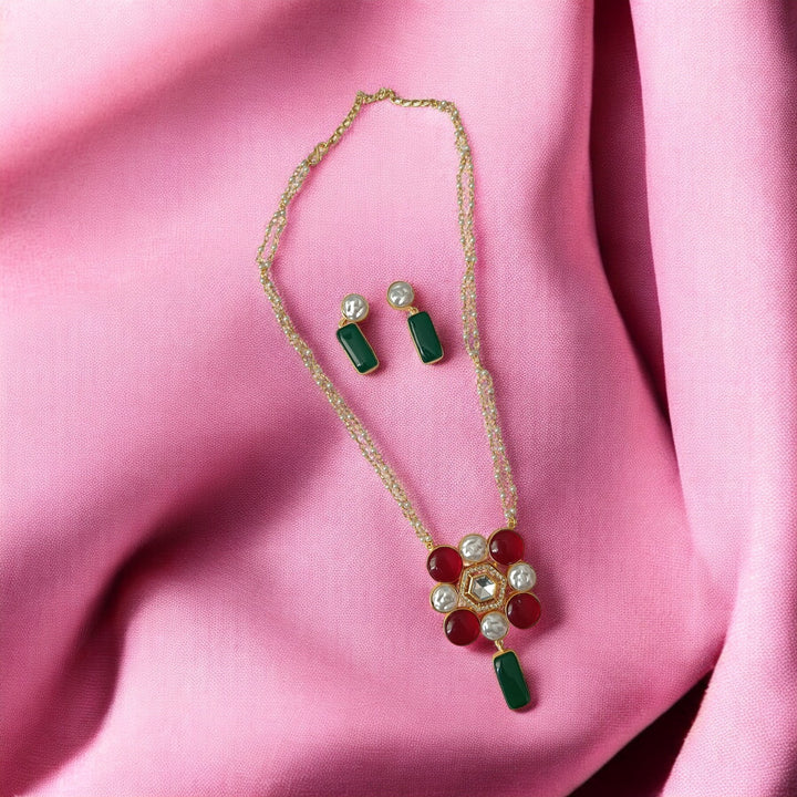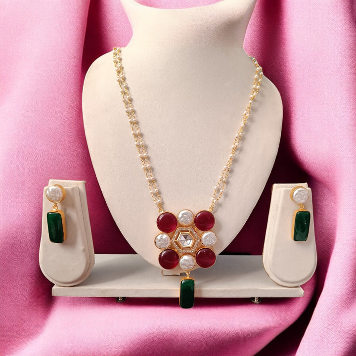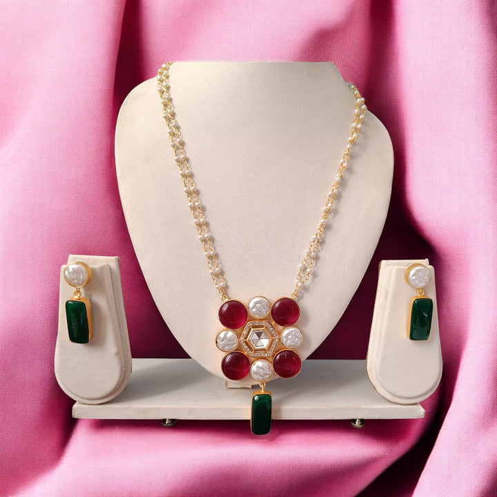 Telanaari Timeless Akaljeet Red Green Baroque Gold Plated Necklace Set - TelaNaari