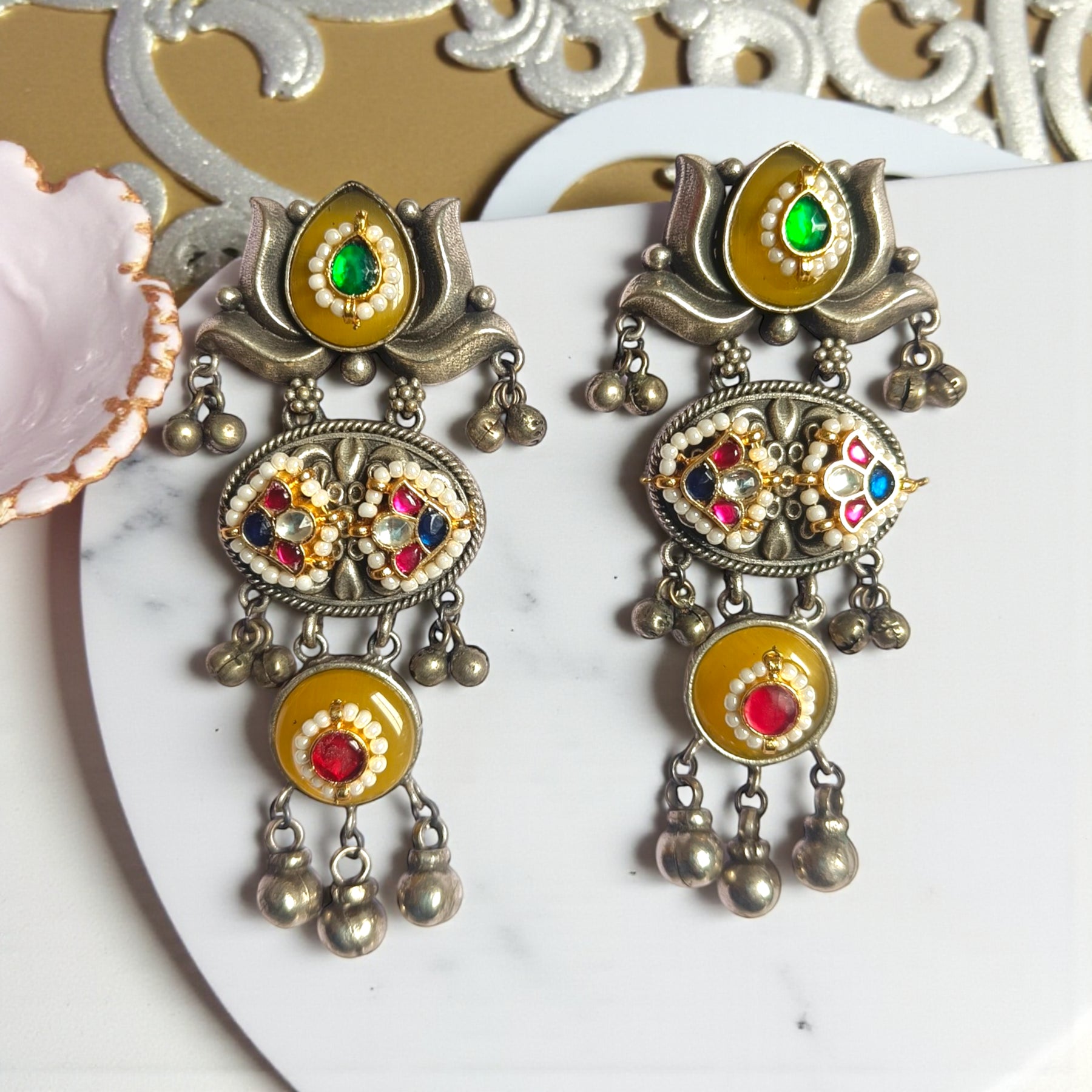 Telanaari Elegant Bornali Dual Tone Fushion Pachi Kundan Silver Plated Earrings