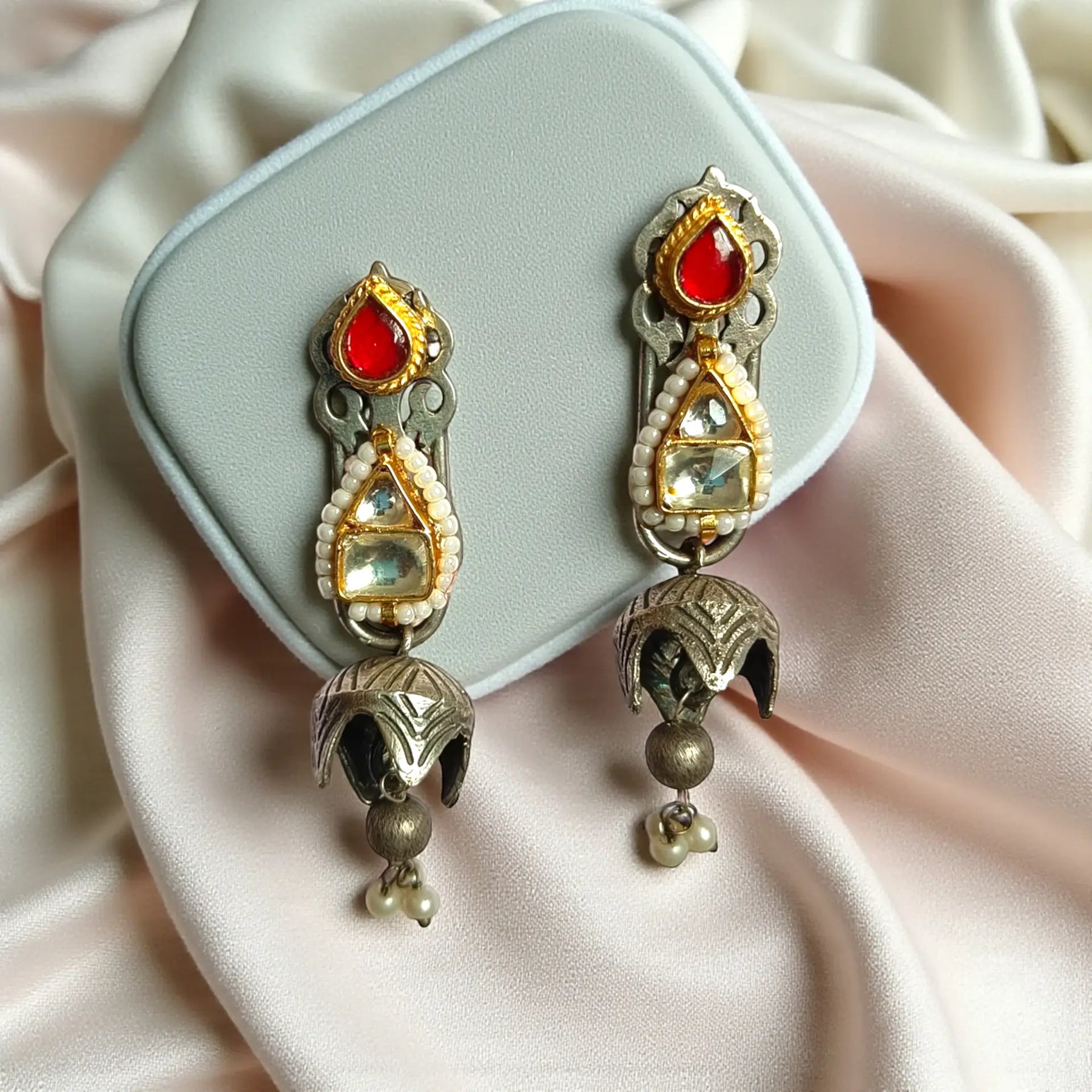 Telanaari Elegant Chitali Dual Tone Fushion Pachi Kundan Silver Plated Earrings
