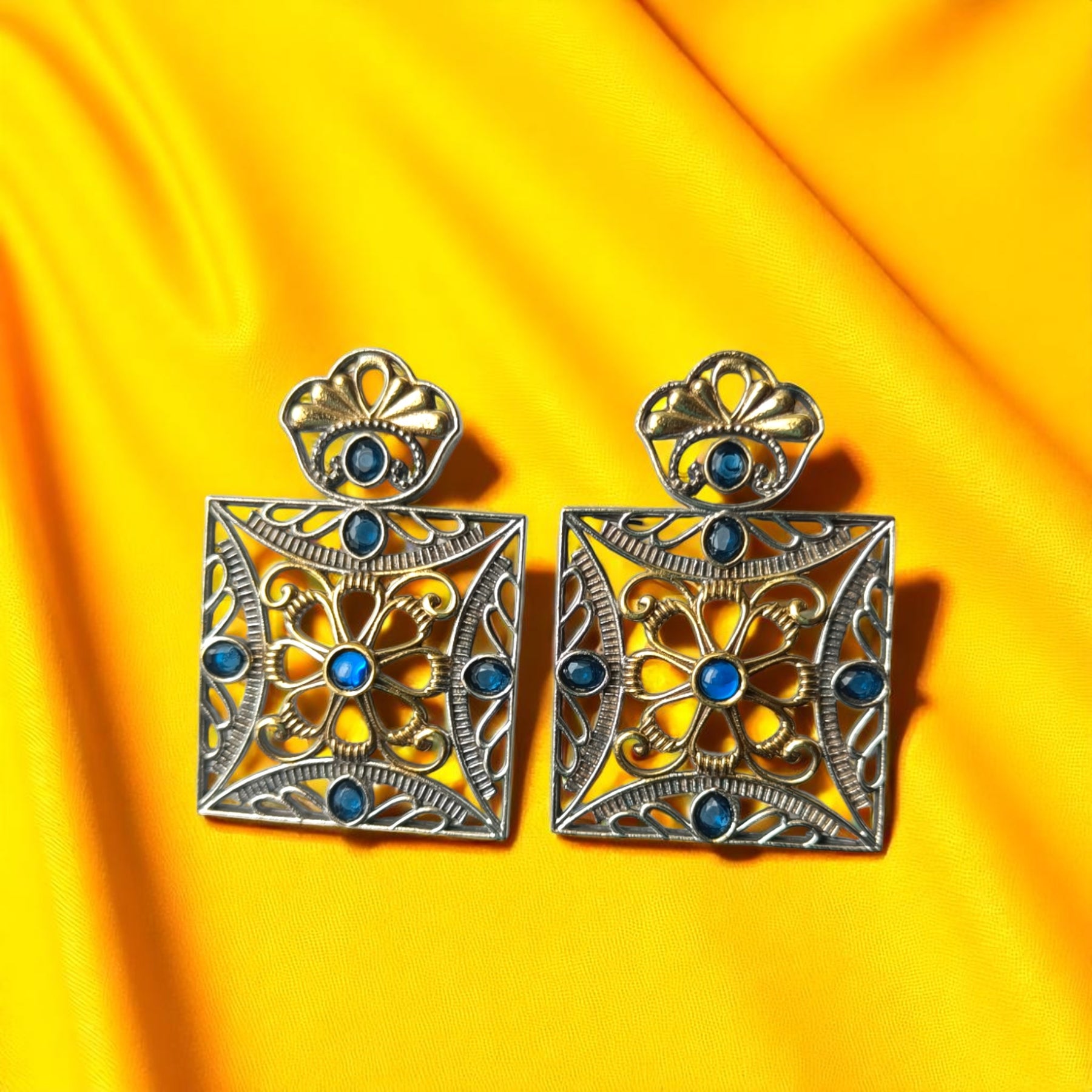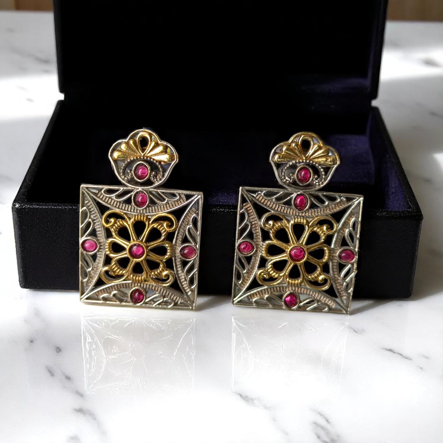 Tela Naari invites you to adorn yourself with a piece of architectural elegance, where intricate design meets regal charm. These earrings are a testament to exquisite craftsmanship, featuring a captivating blend of geometric precision and vibrant artistry. Adorn yourself with these magnificent creations and feel an undeniable presence, transforming every moment into an occasion of sophisticated grace.