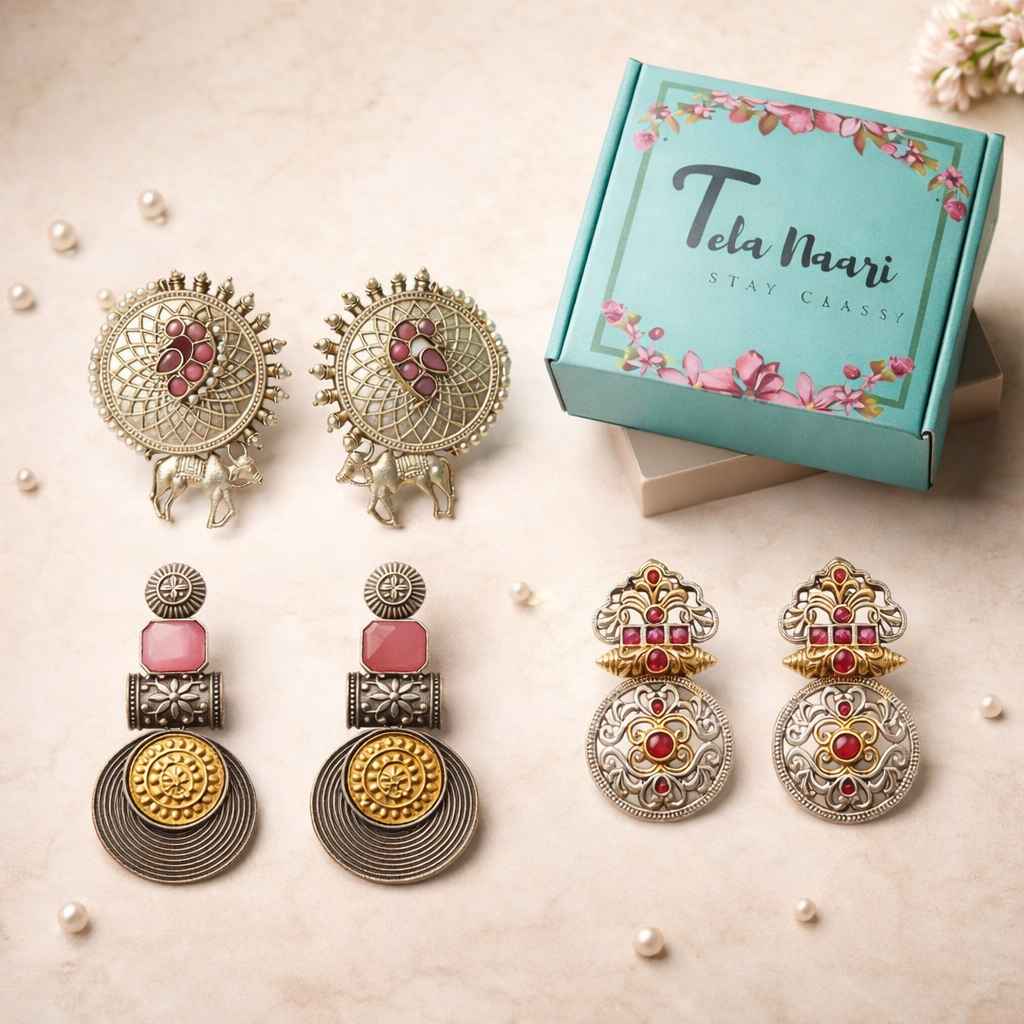 Introducing our TELA NAARI DIVINE DANGLE SILVER OXIDIZED EARRING, the perfect accessory for a friend's wedding. Made with exquisite craftsmanship, these earrings are a timeless addition to your festive attire. Make a statement and celebrate love and friendship with these elegant earrings.