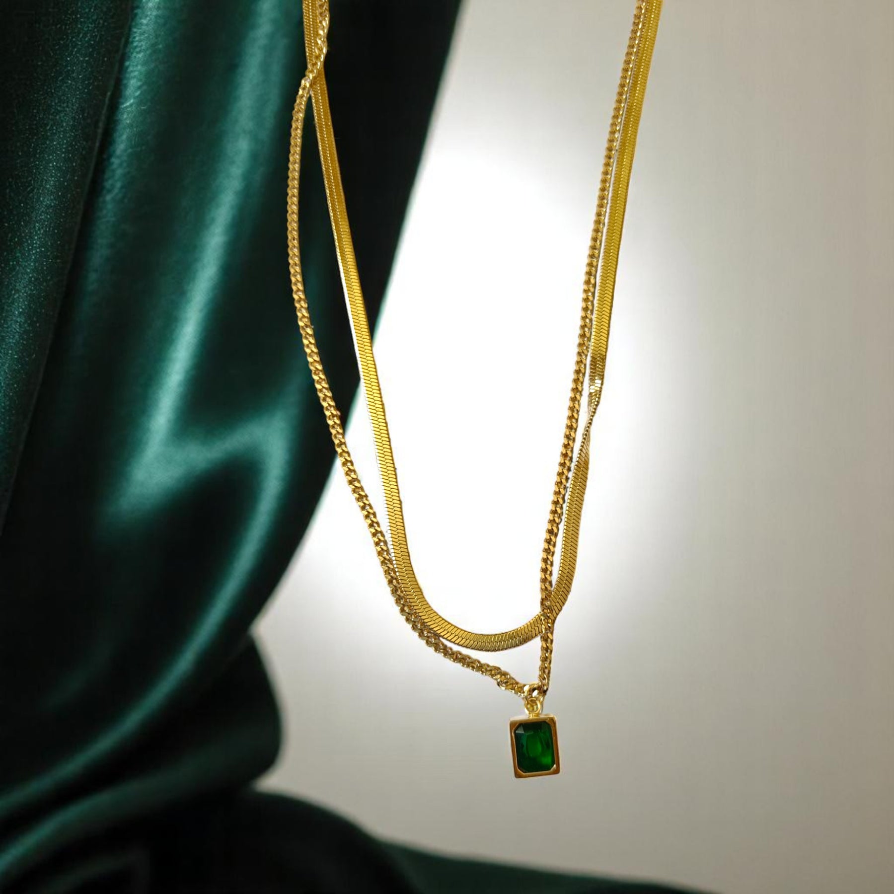 This lightweight necklace features a high-polish finish that catches the light effortlessly. Its layered chain design adds dimension and style, while the emerald-toned pendant brings a vibrant, luxurious charm. The piece is versatile enough to elevate both casual and festive looks, making it a go-to accessory for day-to-night transitions.